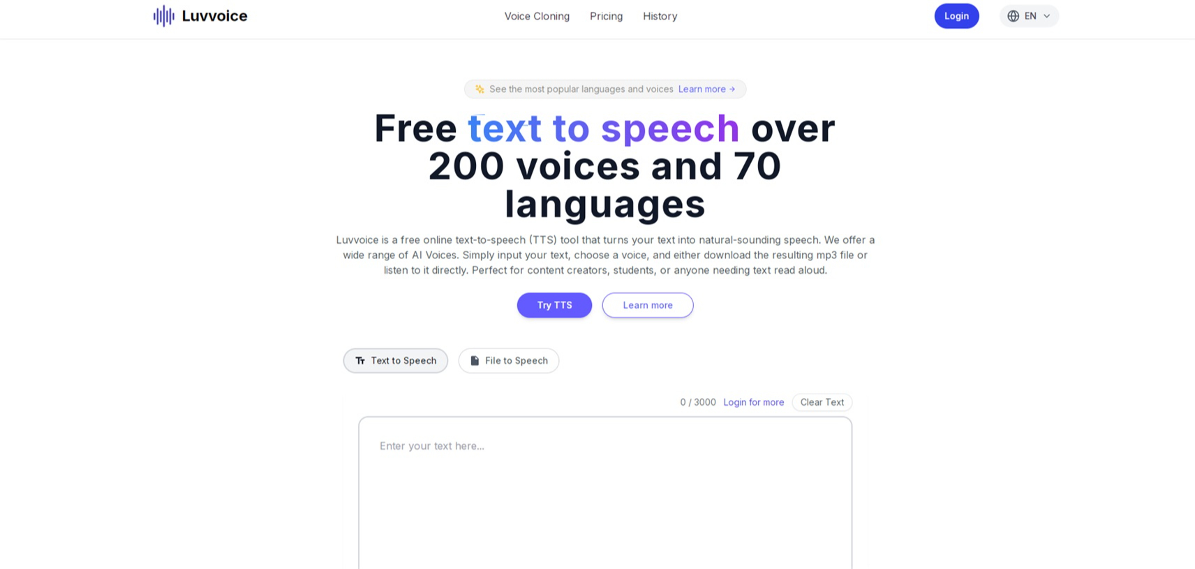 Luvvoice是人工智能文本转语音工具,能够理解文本背后的情绪意图,将这些情绪融入到合成的语音中,可将您输入的文本、上传的文档快速生成为可下载的MP3音频文件。它不像传统的TTS工具那样生硬,Luvvoice能够模拟人类说话时的语调、节奏和情感变化,使生成的语音听起来非常自然,成为了制作有声读物、视频旁白、动画配音等音频内容的理想选择,帮助您以简便的方式实现声音的转换。