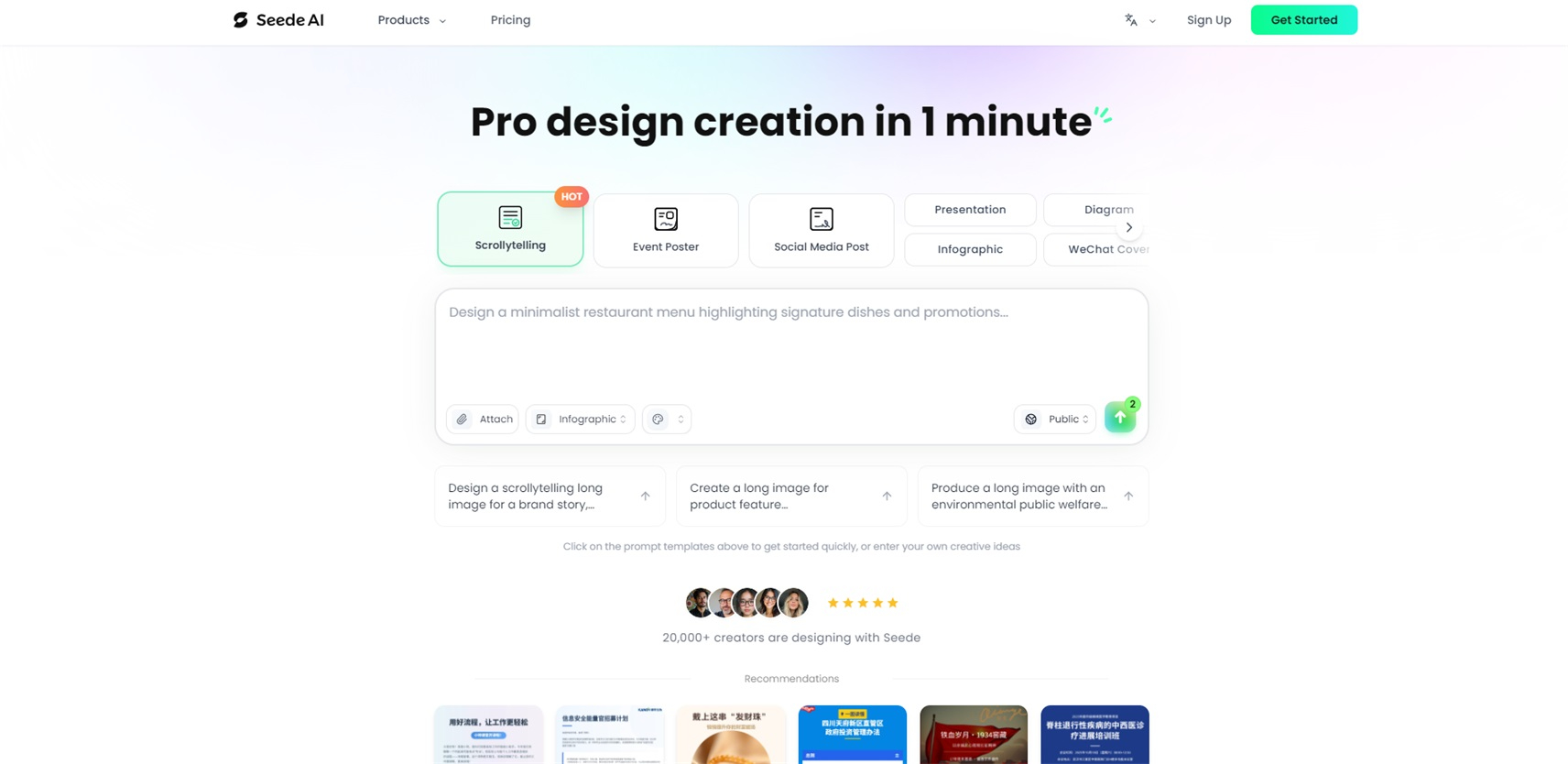 Seede AI是人工智能图形设计工具,专注于商业和社交媒体场景下的视觉内容创作,例如海报、社交媒体配图、广告横幅、产品封面等,可根据您的输入生成设计稿和图像。换句话说,如果您有一个社交媒体帖子、营销海报、邀请函等,而苦于不会设计、没有素材、或者时间紧迫,那么Seede AI的出现恰好为您填补了这一空白。