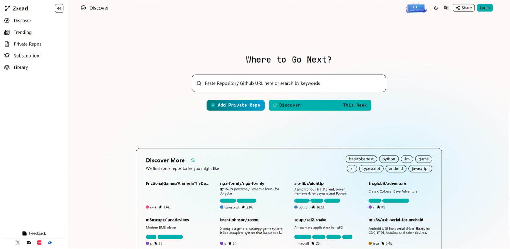 想了解本周GitHub上最热门的项目有哪些,以及它们为何受欢迎。Zread AI就会自动抓取热门项目,为每个项目生成结构化的指南,告诉您项目是做什么的,核心功能是什么,以及社区的看法,帮助您快速把握技术趋势。
