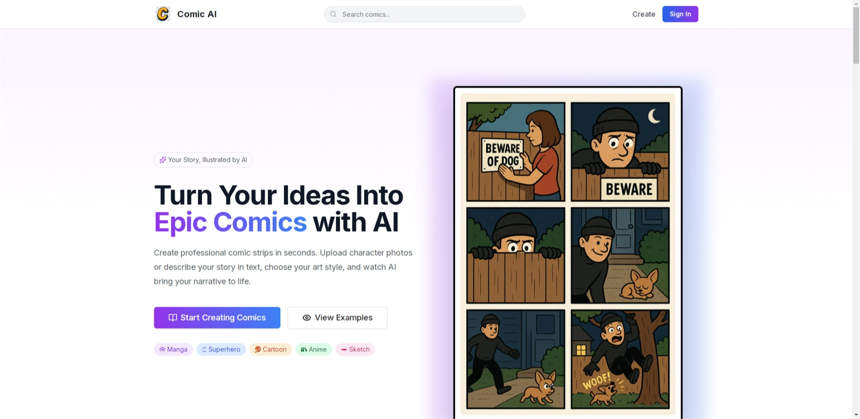 Comic AI是AI漫画创作工具,能够根据描述或草图,自动生成漫画角色、场景、分镜以及完整的剧情,还可以添加符合角色性格的对话气泡。对于没有绘画基础的用户,它是一键生成漫画的神器。